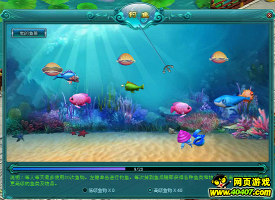 2、每人每天可以垂钓20次,鱼钩或鱼线被贝壳碰到时该次垂钓失败;