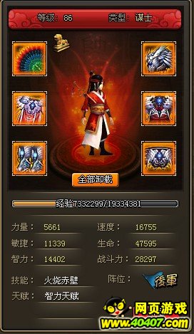 另外还有一个隐藏属性——初始士气。这个属性每人都一样,初始士气为50。对应的石头士气天赋石,也是以百分比的形式加成的,也就说在50士气的基础上按百分比加成。比如自身镶嵌了6块初级士气石,每块8%,则人物出场士气为50+50×8%×6=74,而不是我们容易误认的98。至于速度属性,则只是敏捷值加上人物装备中鞋子的速度为总速度。