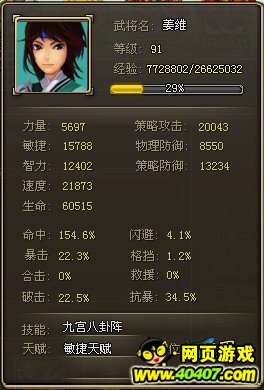 除了上述基础属性之外,龙将人物还有其他属性,它们是命中、闪避,暴击、抗暴,破击、格挡,合击、求援。命中和闪避是相对应的一组属性,两者是相互对立的,两者之间计算也简单,实际是否命中对手,或者命中对手的概率,就取决于自身的命中率减去对方闪避率的数值,如果这个值超过100则必定命中,超出100再多作用也是一样,没有意义。如果该值低于100的话,则是真正命中的概率,如90则有九成概率命中对手。所以命中属性怎么分配给自己的将领,要仔细斟酌一番,可能应对不同对手、不同场合需要做些调整。和前面一组类似,暴击和抗暴也是一组相对的属性。暴击率减去抗爆率既是实际上的暴击概率。