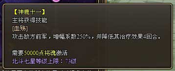血殇:玩家点亮神鹿十一后习得的技能,攻击敌方前军,造成大量伤害,并降低其治疗效果4回合,点亮这一星点需要50000将魂。