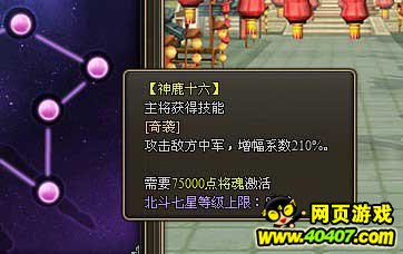 奇袭:玩家点亮神鹿十六后习得的技能,攻击敌方中军,造成大量物理伤害。点亮这一星点需要75000将魂。