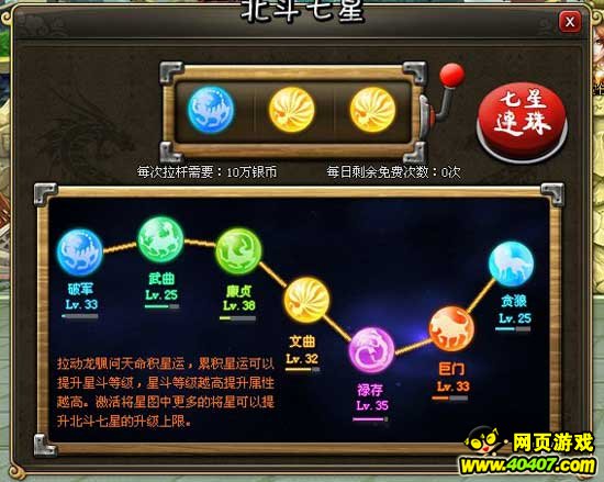 玩家将星图点亮的星点同时还将影响到北斗七星系统中玩家可升级的七星等级上限,从第三张星图开始,每一个星点点亮之后,北斗七星的等级上限将开放到更高等级。点亮神鹿星图的第一个星点,北斗七星上限将开放至52级,而当整个星图全部点亮,北斗七星上限将开放至100级。北斗七星将为上阵的所有武将提供属性加成,所以,它的等级对于玩家整体战斗力的影响至关重要!而更多有关《龙将》神鹿星图的秘密,就留待玩家自己在游戏中探索了!
