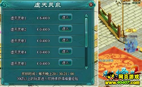 虚天灵泉的开放时间为每天的20:30-21:00,凡是达到30级以上的玩家,都能够通过点击游戏界面上的“灵泉”图标,进入活动区域,接受灵泉的洗礼。需要注意的是,玩家若是处在战场或者副本地图时,需要退出该地图才能进入灵泉。