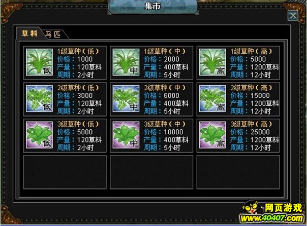 集市中出售供玩家种植饲养的草种和幼马。经过一段时间的培育,可以生成为草料和战马。