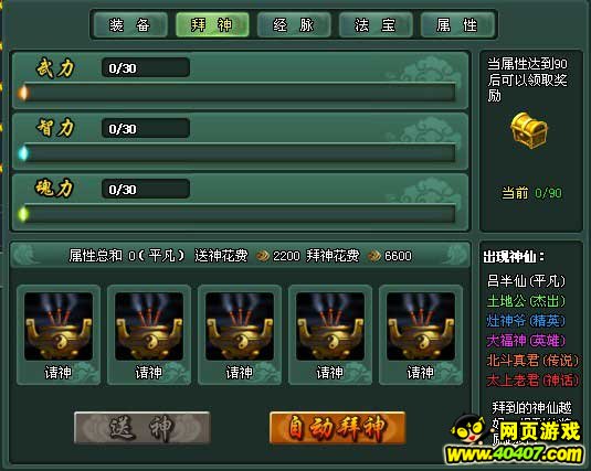 当达到一定级别游戏中出现拜神系统的时候,玩家一定要把主角和最先招募的伙伴品质升到杰出,刷出出蓝色品质以上神仙才点拜神,这样拜神最后不用花3万就可以让伙伴品质升到杰出。每个伙伴升到杰出品质时会有宝箱奖励,内容是28888钱和阅历。请一定要记住:在十级之前把伙伴升级到杰出品质是最省成本的。