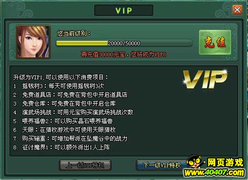 进入37wan《除魔》后,最少冲个V1,这一点也很重要,毕竟VIP1玩家将享有许多特权,如每天使用3次摇钱树、可以免费在背包中打开仓库、可以购买晶石喂养福兽等等,而对游戏前期来说,铜钱还是很重要的。
