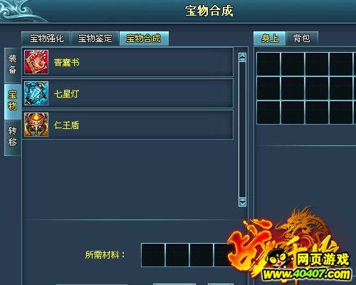 玩家在合成宝物之前需要收集一定的材料,三种法宝的合成皆需要聚灵丹、神秘晶体这类材料。除此之外,青囊书还需青囊书残页、七星灯还需照明灯蜡、仁王盾还需坚韧墨钢。上述几种材料玩家除了可以在英雄战域副本、九宫玄阵处刷怪获得,击杀野外BOSS也有一定的几率取得。