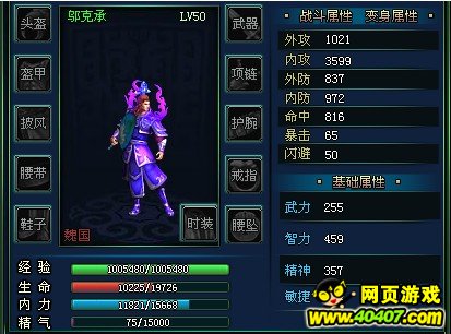 《战武》游戏内角色战斗属性分为生命、内力、外功攻击、内功攻击、外功防御、内功防御、命中、闪避、暴击、韧性、必杀和移动速度。