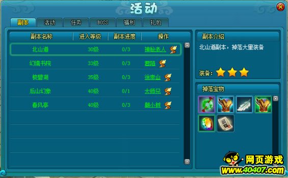 30级可以接触第一个副本:北山道。副本内会掉落一些蓝色装备,击杀里面的BOSS也有机会打到通灵玉和洗练石,对于前期提升装备实力很有用。这个副本每天只可以打3次哦。