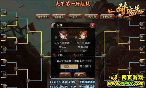 在《一骑当先》跨服战比赛过程中,玩家可以花费一定的银币对参赛选手下注。若玩家下注的选手获胜,可获得下注金额一倍的奖励;反之则输掉下注金额的一半。如果你想到通过下注来捞一笔金的话,切莫把希望赌在运气上,做好前期工作,同样至关重要。最好是在下注前,先通过观战前几轮的赛况,对各个选手的实力进行比较总结,最后选择自己最看好的选手,进行精准下注,才更有胜算!