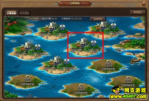 3.在实力较弱的时候,如果占领了几个岛屿,尽量在第二次劫掠后放弃一个岛屿,然后重新征战,这样可以保证在半小时的免战期后不被人夺走。如果可以的话,尽量将征战的时间间隔开,最好在两分钟左右,这样可以在征战后的冷却时间内保证与所占领岛屿的时间同步,方便使用刚才的“占领——放弃”战术。