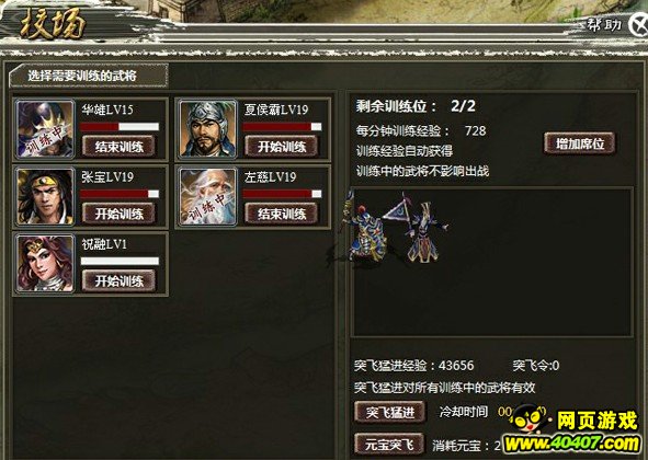 在封地的校场里可以训练武将。在这里进行训练的武将可以随着时间获得经验值。校场等级越高,经验也越多。校场初期只有一个训练位置,玩家可以花费元宝开启额外的席位,供多位武将同时训练。还可以进行突飞,立即获得大量经验。