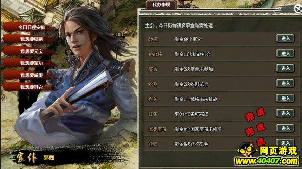 在游戏界面右下方的家仆会经常提醒玩家可以做的事。玩家也可以自主打开家仆界面查看今日尚未完成的事项。