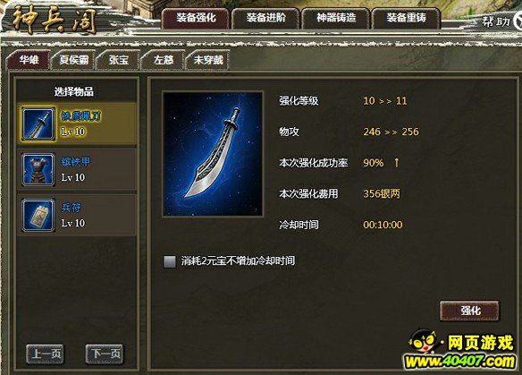 装备的强化相对比较简单,只需要花费银两提升装备的等级即可。提升时会消耗神兵阁的冷却时间,当时间不足以强化时则必须等时间恢复才能继续强化。强化时也可能会失败,失败将返还一定的银两。装备的强化最高等级不能超过神兵阁等级,所以提升神兵阁的等级也是很重要的。