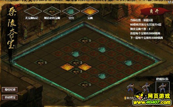 在夺宝界面玩家可以选择一支挖宝队伍进行挖掘,挖掘后会显示该格和周围有多少宝藏,类似扫雷。使用更高级的挖宝队挖到宝藏格可以获得翻倍的银两,所以秦陵夺宝也是一个脑力活动哦!