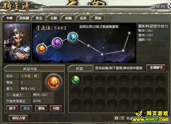 将星可以给武将装备使武将获得相应的能力。武将每10级可以多装备一个将星。不需要的将星可以卖出以获得星运,用星运升级有用的将星来提升将星的属性。