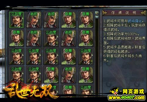 2012零职业动作革新页游《乱世无双》是一款以“大动作”为核心的网页游戏,推出了极具特色的“武将诀”玩法。游戏为广大玩家提供了上百名武将可供选择,并分有鬼才、强弓、先锋、甲士四种类型。谁能够拥有一名惊天地泣鬼神的武将,谁就可以成为乱世之王。今天,就让我们一起翻开《乱世无双》畅玩百科,一起看看非R玩家在游戏中,应该怎样锻造出一名强大的武将吧!