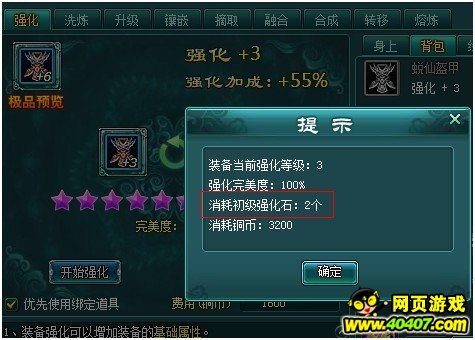 有人说,这个星级是随机1-10星的,星级不满你就上不了下一个强化等级,神马几率之类的东西最烦了。关于这个嘛,我个人的说法就是:小R总是难免有这样的困扰,当然你也要量力而行,一个小R还是不要去追求神马+12了,安安分分的+8就行。如果是大R的吧,这里倒是省心多了,你可以直接点击自动强化,他会扣除你的强化石,然后帮你强化到完美度100%(10星)。扣多少个强化石看你RP了,当然强化等级越高扣的越多: