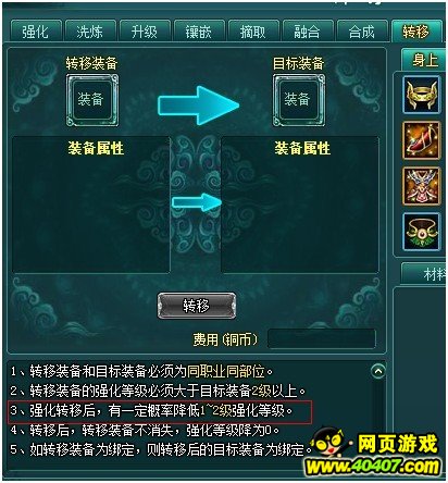 转移功能主要是帮你把30级的装备强化等级转移到40级的装备上并,并且两件装备都同时保留。条件就是必须同职业同部位的装备,并且转移的装备强化等级必须大过目标装备2级。但也有一点非常恶心的地方,就是强化等级会有可能掉1~2级: