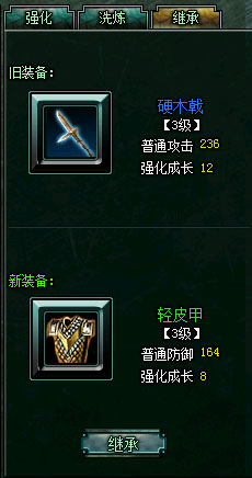 继承可将一件已经强化过的装备的强化等级,根据一定的折扣附加到另一件未被强化过的装备上。只有没有强化过的装备才可以被继承。继承成功后,原装备强化等级归0。
