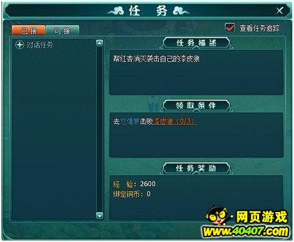 在游戏界面的右边,有任务显示框体,三个任务分区:【当前任务】、【可接任务】和【全部】。