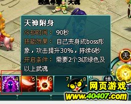 PS:如果40级还不知道武魂这玩意的童鞋,赶紧去搞几个。推荐是气血、攻击和防御。两蓝色的武魂即可获得魂技——天神附身。
