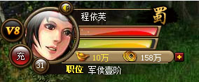 位于主界面的左上角,玩家可以在此处清晰的看到自己的基本信息,包括阵营、姓名、音乐开关状态、等级、vip等级、官职官阶、元宝与铜钱的数量以及粮草的消耗情况。