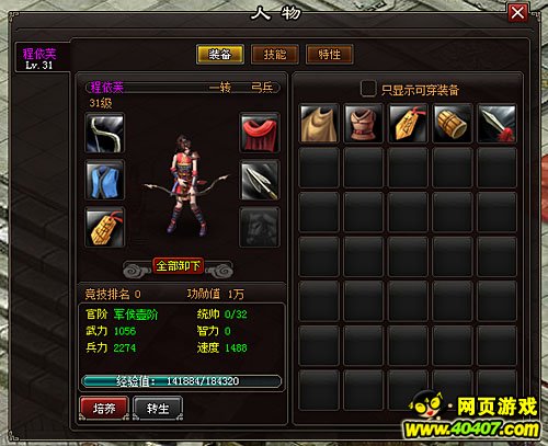 玩家可以在英雄界面中查看英雄的装备、技能以及特性,在装备与技能标签下,可以快速的对英雄进行穿着装备与装备技能卡,还可以对英雄进行培养、转生与解雇。