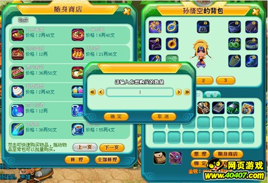 在商店中双击一个道具,可以购买1个此道具,在商店中点击一个道具并拖动到背包栏格子内,会弹出批量购买提示框,输入指定的购买个数时批量购买。