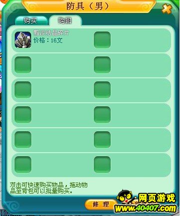 在商店界面里点击“修理”按钮时,鼠标变成“修理”形状,鼠标在这个状态下点击背包里的装备或装备栏的道具,则对此装备进行修理。