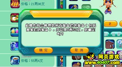 点击“全部修理”后,打开提示框,提示玩家本次修理所花费的游戏币,玩家确定后将玩家装备栏上的所有装备全部修理。