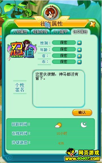 社交属性处会显示该玩家的信息,包括性别、年龄、区域、在线时间、活跃时间、升级速度、个性签名。