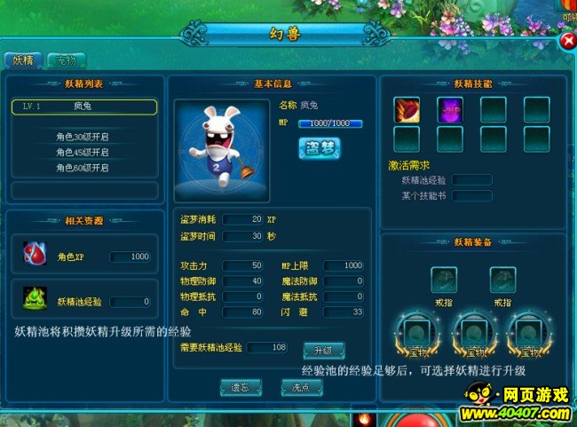 选择妖精,当妖精经验池里的经验大于妖精升级所需经验时,玩家就可以点击“升级”按钮就可以对妖精进行升级了。