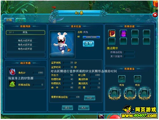 盗梦不同的妖精消耗的XP是不一样的,并且妖精形态只能维持一定的时间,具体的XP消耗要求和妖精形态维持时间可在【幻兽】-【妖精】界面中查看: