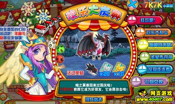 答:在中秋时通过做任务可获得暗之翼兽,之后就结束了。好多玩家还没有自己的暗之翼兽战宠,不过现在好了,暗之翼兽回来过国庆了,只要在10月20日之前,跟暗之翼兽成为好朋友,连续6天陪她玩耍他就会跟着你走了。赶快去拥有你的暗之翼兽吧!!