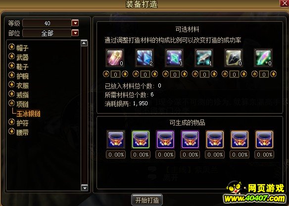 打造界面分为左右两个部分,左边选择装备,右边显示材料与打造可能得到的装备属性。可以通过选择等级、部位,快速定位要打造的装备。