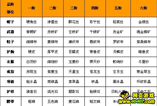 9个部位的装备,每个部位的装备都需要一种材料,每一种材料都分为:一阶、二阶、三阶、四阶、五阶、六阶;