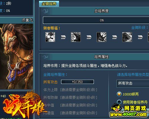 在573《战千雄》中,玩家可以对自己的坐骑进行培养,从而提升坐骑的战斗力。坐骑培养分为两种方式:一种是通过消耗10000绑定银两,选择坐骑的特定属性进行培养;另一种是在商城购买坐骑培养丹进行培养。值得一提的是,每次培养都有一定的成功率,培养失败的话,坐骑原有的属性值就会降低。