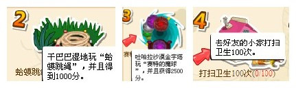 第一关是:蛤蟆跳绳获得1000分; 第二关是:赛特的魔球获得2500分;第三关:去好友小家打扫卫生100次