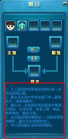 再过来我们来看看这融合的说明,基本上的话不难理解,意思就是副宠是融合在主宠去的,同时会把它的“最高”的资质,悟性,上限,等级,携带等级,属性点都融合过去。但别忘记了还有一项是没有的,就是宠物的技能,副宠是不会把它的技能也融合过去主宠上的,意思是,如果你副宠无论学习了是顶级还是初级的技能书,一融合,全部为0,这点大R们就真的需要谨慎行事了,毕竟顶级的技术书可是几十块一本的呢。