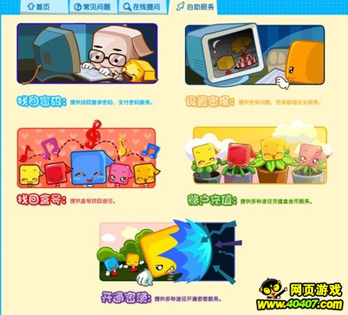 帮助中心还有一个很方便的工具哦——那就是自助服务啦!有5个内容可以进行自助服务哦:找回密码、设置密保、找回盒号、账户充值、开通密使!