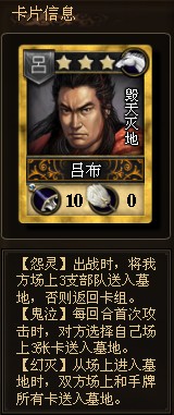 吕布大家都很熟悉吧,来看游戏中吕布的设定,他有3颗★,出战需要3粮草(正常情况下,粮草每回合补给1点),在游戏中只要一出站立刻威风八面,算是很强大了。与银?将领卡不同的是,每张金?将领卡拥有自己的特殊技能,这些技能的组合千变万化。相对游戏王来说,这里面的金?将领卡相当于效果召唤怪。