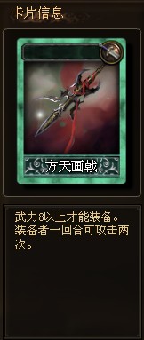 呵呵,“方天在手,天下我有”,有将领当然有装备,可惜小编还没收集到赤兔马,这个方天画戟就是装备卡了,效果大家一看就明白。