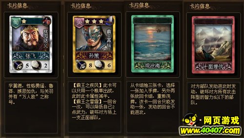 卡组:这里是你创建具有中国主义公民特色卡组的地方。卡片一共分为3种,分别是武将卡、计策卡、陷阱卡。其中武将卡又分为银卡跟金卡,银卡是普通的武将卡,而金卡是具有一定效果或者武将技能的强力武将。武将卡上包含了所属国家(左上)、星段(中上)、兵种(右上)、称号(中右)、武将名(中)、武力(下左)、智力(下右),最下方是武将信息以及武将所具备的能力。计策卡(绿色)是可以直接从手卡发动的效果卡,也可以覆盖到战场上迷惑敌方等待时机的到来。陷阱卡(红色)则必须先覆盖到场上,等到必要的时候发动,不过刚放下的回合是无法发动的。卡片还分成好几个稀有等级,越是珍贵的卡片,就越难入手。组牌是一门艺术,是一门学问,是通往胜利的闪光之路。