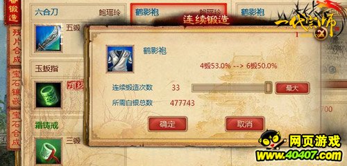 宝剑配英雄!《一代宗师》中,要想称霸武林,各掌门自然离不开神兵利器!在锻造间中,找到铁匠即可请他为自己的装备进行强化,每次强化都是100%成功的噢,若与铁匠关系亲密的话,更有可能触发双倍强化或者成本返还的好事情!