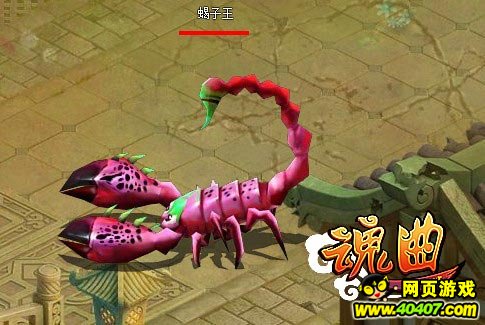 蝎子王食肉性怪兽,蝎取食时,用触肢将捕获物夹住,后腹部(蝎尾)举起,弯向身体前方,用毒针螫刺。毒腺外面的肌肉收缩,毒液即自毒针的开孔流出让对手没有还手的余地,立马死于非命。60级的蝎子王藏匿地古都度墟,由于此怪物实力雄厚,玩家们需要集合自己所有的力量向它开火,谁能给BOSS最后的致命一击谁就可以赢的高额的奖励,受万人敬仰。