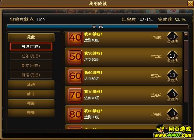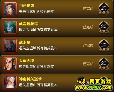 在成就页面,最上方有一个完成度的显示条。根据你完成任务的多少,会有一个非常明确的显示。成就分为很多类。有一些是根据升级的时候自动完成的,如40级、50级的成就。这些成就在你达到相应的等级时,自动完成。还有一些是副本通关的成就。玩家每升10级,就会进入一个全新的地图,里面有全新的副本,当玩家打通其中的某一个副本时,对应的成就也就自动完成了。