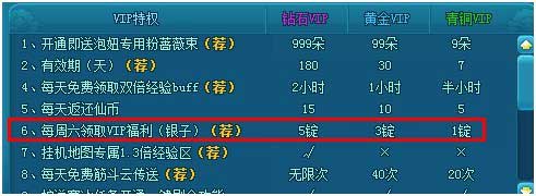 每个星期六,只要是VIP都可以领取绑定的银子,钻石VIP=5锭,黄金VIP=3锭,青铜VIP=1锭。