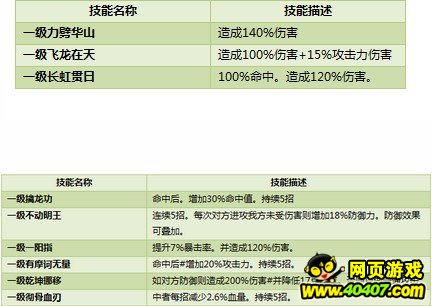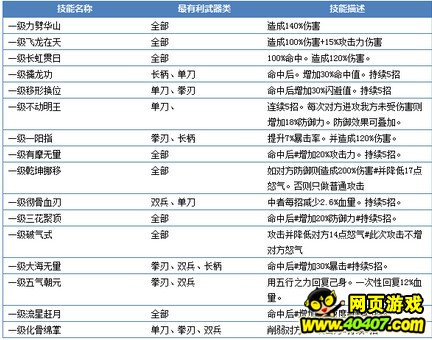 大家可以看到,在第一图技能说明上,前三项武功招式的描述基本上都属于直属伤害。而后面六项招式都附带效果,有对自己增益的,有对敌方削弱的。而这样类型的招式则要选择性的给不同武将。对于后期的不同招式,玩家应随角色的属性来一同参考。如:一级一阳指,在瞬间提高暴击,给予高攻高暴的角色有着明显的成效。拳刃与长柄最适合不过了。但装备给单手剑,或是双兵类武将问过使用,效果则会平庸很多。
