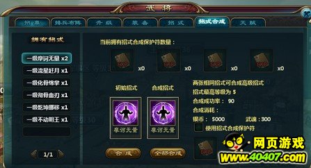 在左侧拥有招式栏中点击要升级的武功招式(招式数必须大于2),界面会显示初始招式、升级后的招式、升级所需银币和武魂、合成后技能,以及合成成功率。